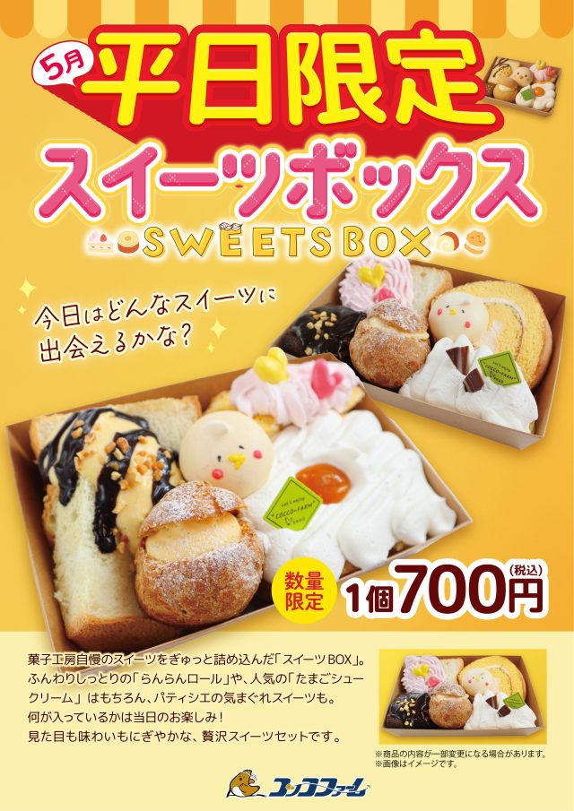 5月平日限定「スイーツBOX」販売! 2025/5/1 カテゴリー: 5月平日限定「スイーツBOX」販売 期間:2025年5月12日(月)~5月30日(金) 価格:1個 700円(税込) 菓子工房自慢のスイーツをぎゅっと詰め込んだ「スイーツBOX」。 ふんわりしっとりの「らんらんロール」や、人気の「たまごシュークリーム」はもちろん、パティシエの気まぐれスイーツも入っています。何が入っているかは、当日のお楽しみ。 見た目も味わいもにぎやかな、贅沢スイーツセットをぜひ味わってみてください。