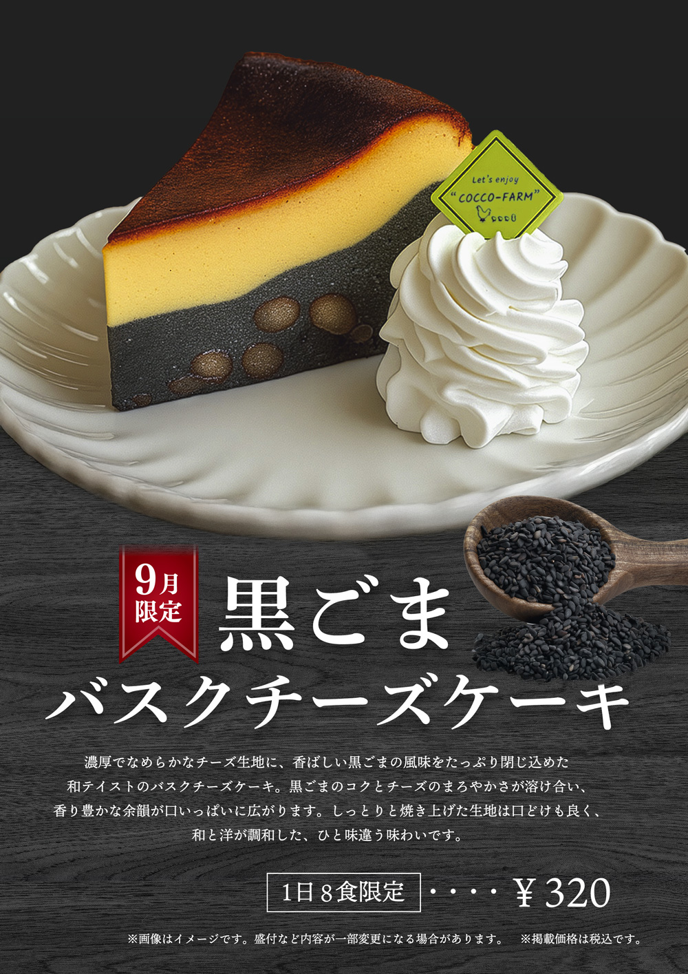 【レストラン】9月限定「黒ごまバスクチーズケーキ」 2025/8/31 カテゴリー: レストラン 9月限定「黒ごまバスクチーズケーキ」 <提供時間 11:00~> 320円(税込) ※1日8食限定。 濃厚でなめらかなチーズ生地に、香ばしい黒ごまの風味をたっぷり閉じ込めた和テイストのバスクチーズケーキ。 黒ごまのコクとチーズのまろやかさが溶け合い、香り豊かな余韻が口いっぱいに広がります。 しっとりと焼き上げた生地は口どけも良く、和と洋が調和した、ひと味違う味わいです。 ※画像はイメージです。盛付など内容が一部変更になる場合があります。※掲載価格は税込です。