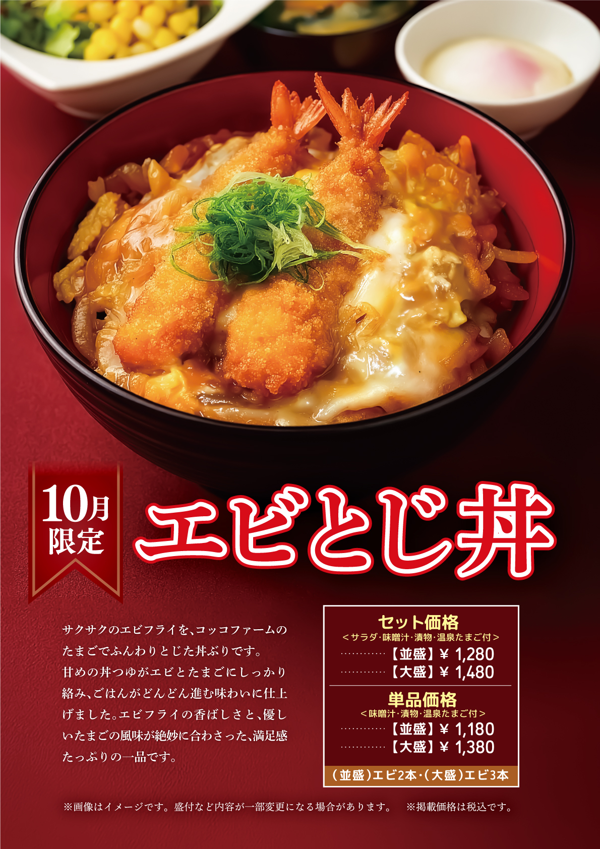 サクサクのエビフライを、コッコファームのたまごでふんわりとじた丼ぶりです。