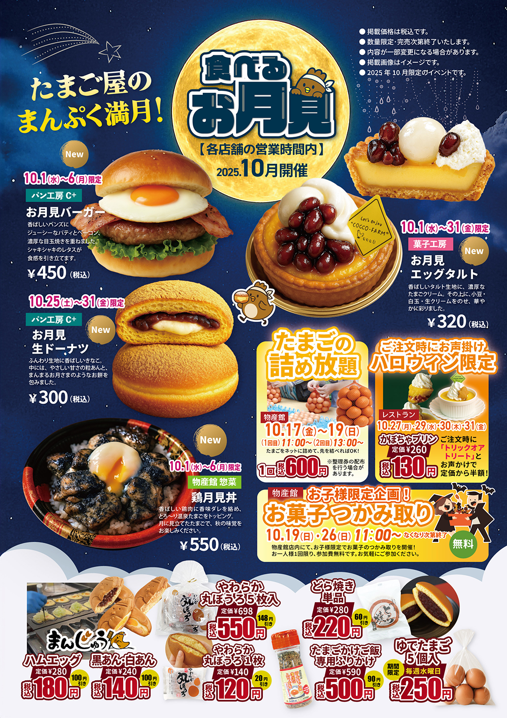 ・(10/17~19)たまごの詰め放題(1回目11時~・2回目13時~)1回600円・整理券の配布を行う場合があります。