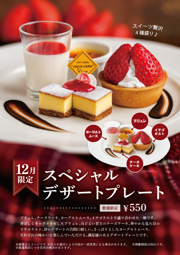 ブリュレ、チーズケーキ、ヨーグルトムース、イチゴタルを盛り合わせた一皿です。香ばしくキャラメルリゼしたブリュレ、ほどよい甘さのチーズケーキ、華やかな見た目のイチゴタルト、甘いデザートの合間に嬉しい、さっぱりとしたヨーグルトムース。それぞれの味わいを楽しんでいただける、満足感のあるデザートです。