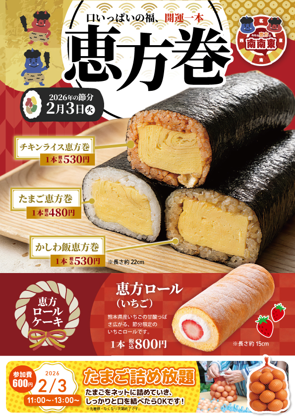 2026年の2/3節分は、福を呼び込む「恵方巻」と、ふんわり甘い「恵方ロール(いちご)」をご用意します。