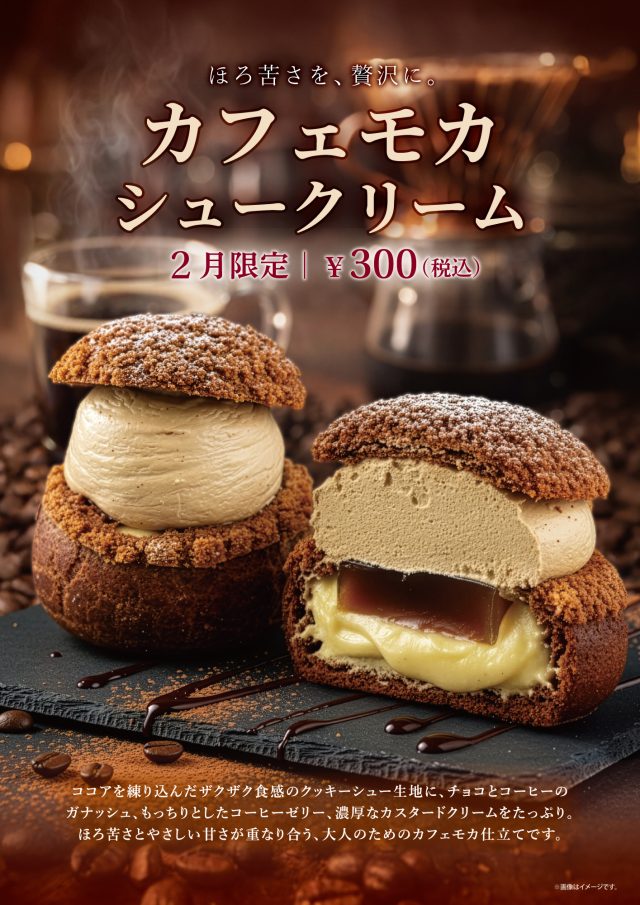 【菓子工房】2月限定「カフェモカシュークリーム」 2026/1/30 カテゴリー: 菓子工房 2月限定『カフェモカシュークリーム』1個300円(税込) ~ほろ苦さを、贅沢に~ ココアを練り込んだザクザク食感のクッキーシュー生地に、チョコとコーヒーのガナッシュ、もっちりとしたコーヒーゼリー、濃厚なカスタードクリームをたっぷり。ほろ苦さとやさしい甘さが重なり合う、大人のためのカフェモカ仕立てです。 ※数量限定・完売次第終了。