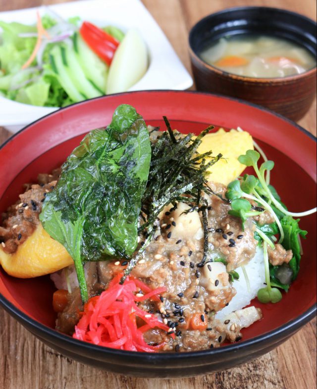 ●10種野菜のオムレツ鶏そぼろあんかけ丼(味噌汁・サラダ付)…920円