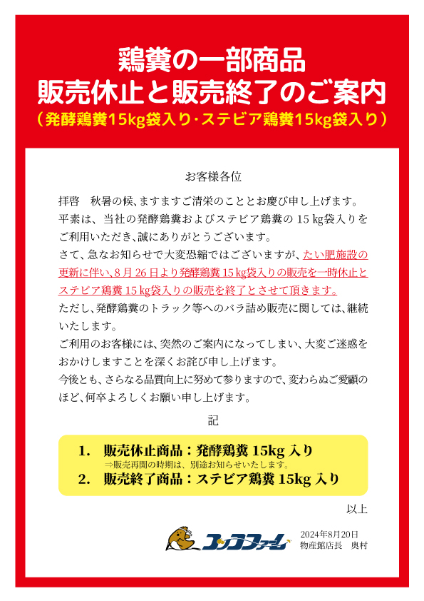 さて、急なお知らせで大変恐縮ではございますが、たい肥施設の更新に伴い、8月26日より発酵鶏糞15㎏袋入りの販売を一時休止とステビア鶏糞15㎏袋入りの販売を終了とさせて頂きます。ただし、発酵鶏糞のトラック等へのバラ詰め販売に関しては、継続いたします。ご利用のお客様には、突然のご案内になってしまい、大変ご迷惑をおかけしますことを深くお詫び申し上げます。