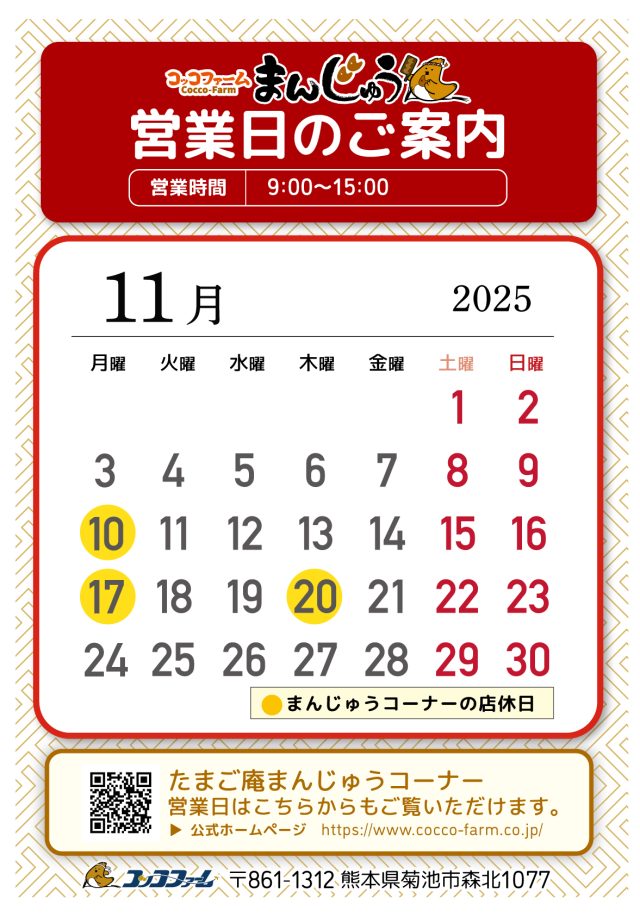 たまご庵まんじゅうコーナー【11月営業日のご案内】 2025/10/27 カテゴリー: お知らせ 「たまご庵まんじゅうコーナー」より11月営業日のご案内です。 <店休日> ・11/10(月曜) ・11/17(月曜) ・11/20(木曜) <営業時間> 9:00~15:00 皆様のご来店を心よりお待ちしております。