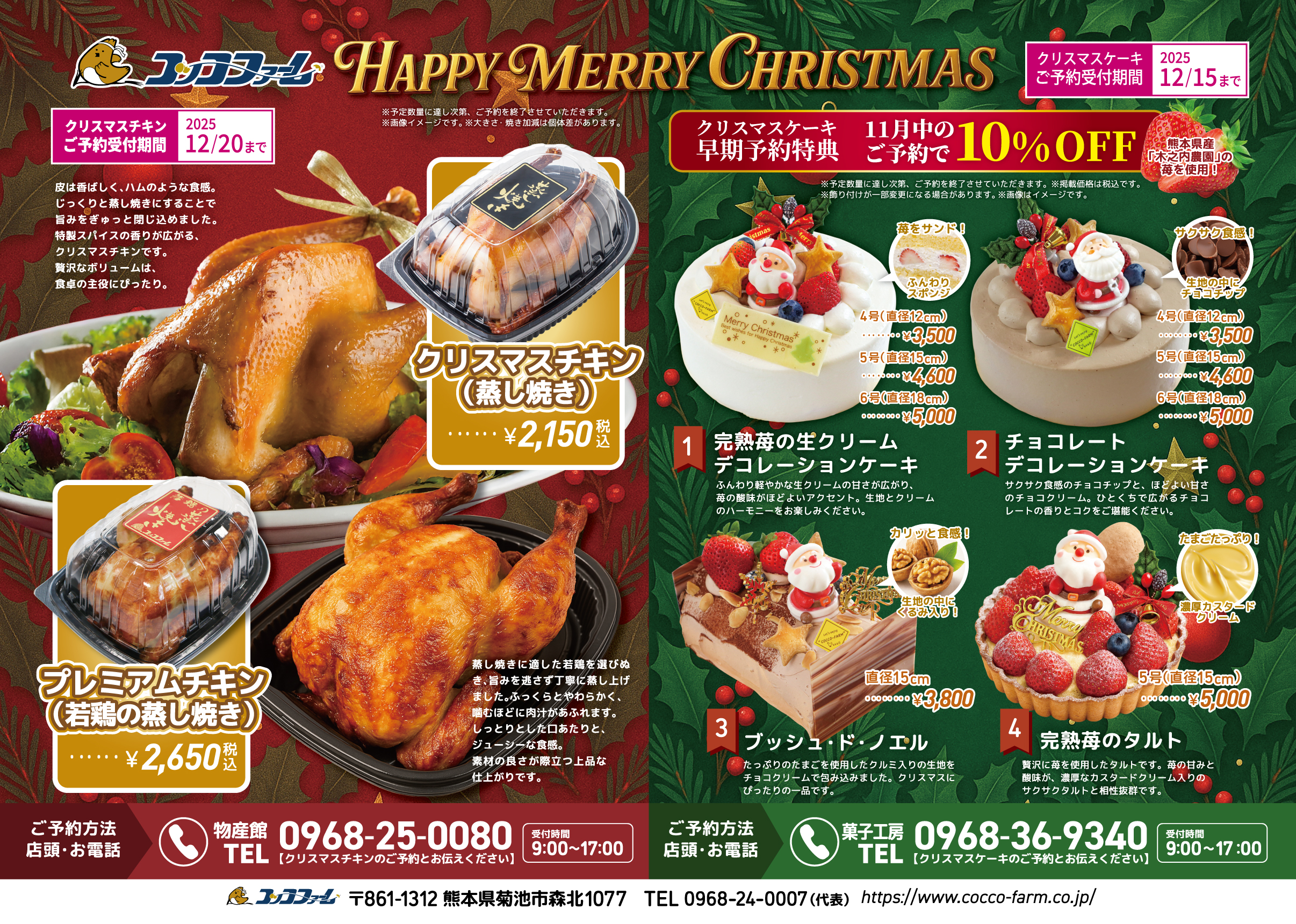 今年のクリスマスは、こだわりの「クリスマスチキン(蒸し焼き)」と、見た目も味も華やかな「クリスマスケーキ」で、ご家族やご友人との特別な時間をお楽しみください。