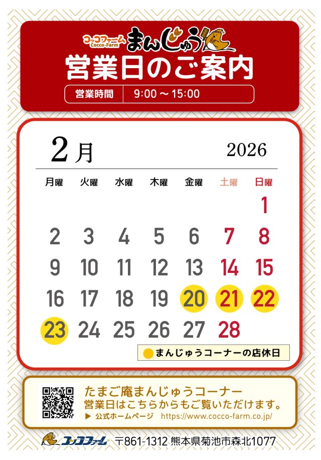 たまご庵まんじゅうコーナー【2月営業日のご案内】 2026/1/28 カテゴリー: お知らせ 「たまご庵まんじゅうコーナー」より2月営業日のご案内です。 <店休日> 2月 20日(金曜) 2月 21日(土曜) 2月 22日(日曜) 2月23日(月曜) <営業時間>9:00~15:00 皆様のご来店を心よりお待ちしております。