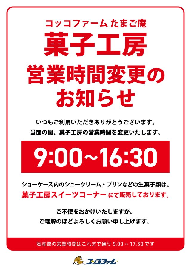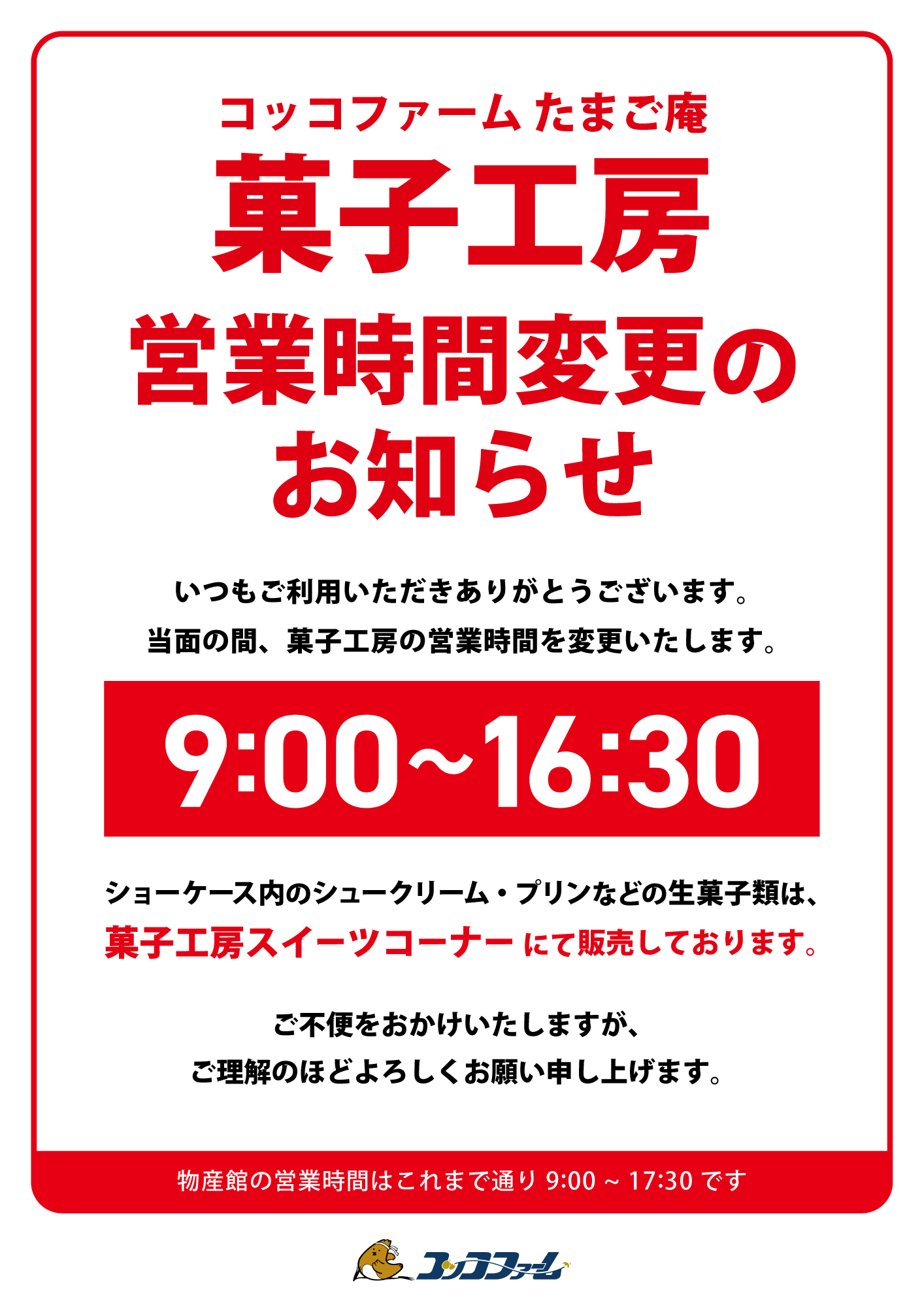 菓子工房 営業時間のお知らせ 2026/2/23 カテゴリー: お知らせ いつもコッコファームをご利用いただきありがとうございます。 当面の間、菓子工房の営業時間を変更いたします。 【菓子工房 営業時間】 9:00~16:30 なお、ショーケース内のシュークリーム・プリンなどの生菓子類は、 「菓子工房スイーツコーナー」にて販売しております。 ご不便をおかけいたしますが、ご理解のほどよろしくお願い申し上げます。
