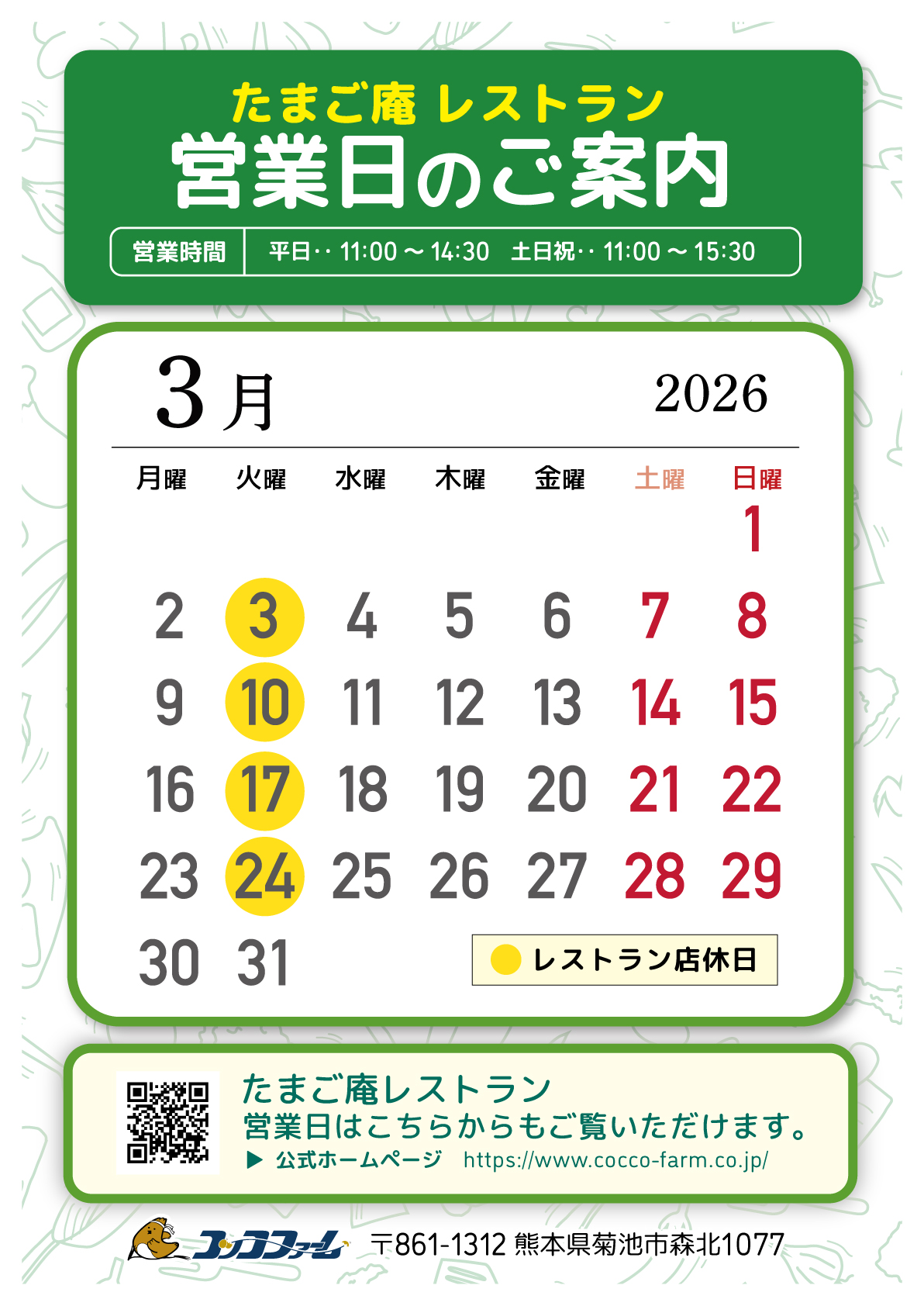 たまご庵レストラン【3月営業日のご案内】 2026/2/28 カテゴリー: お知らせ 「たまご庵レストラン」より3月営業日のご案内です。 <店休日> 3月 3日(火曜) 3月 10日(火曜) 3月 17日(火曜) 3月 24日(火曜) <営業時間> (平日)11:00~14:30(土日祝)11:00~15:30 ※ラストオーダーは営業終了30分前 皆様のご来店を心よりお待ちしております。